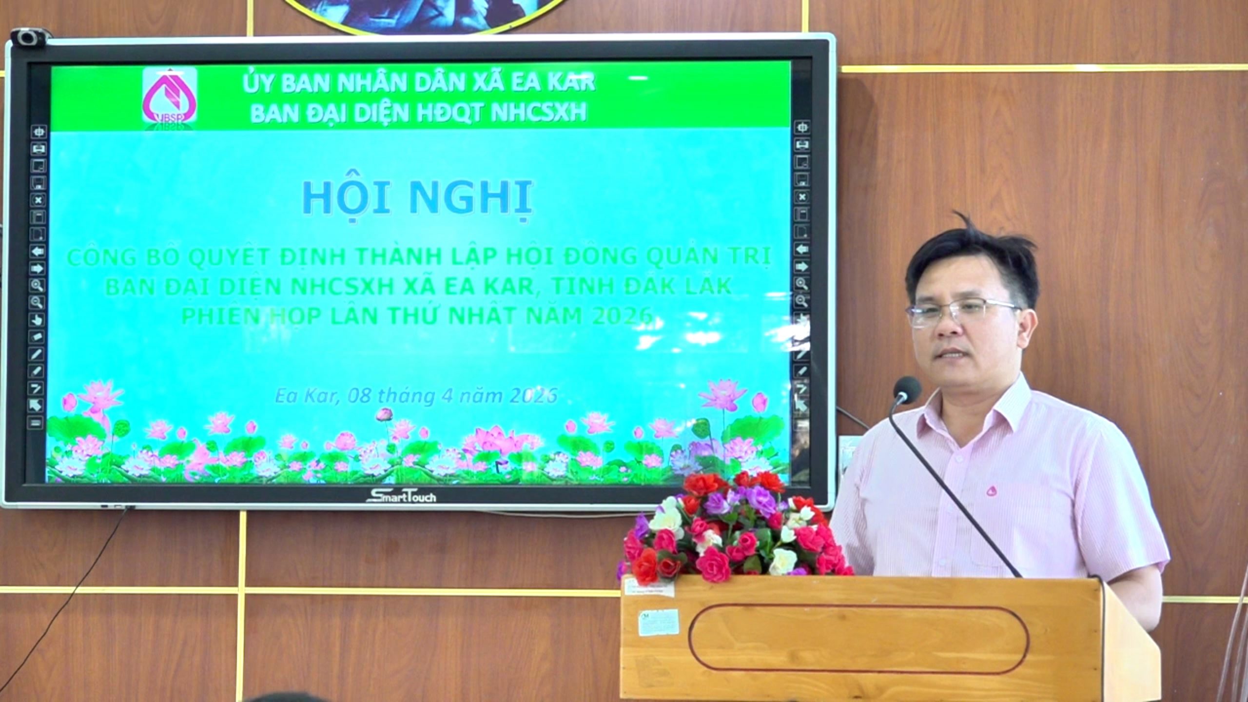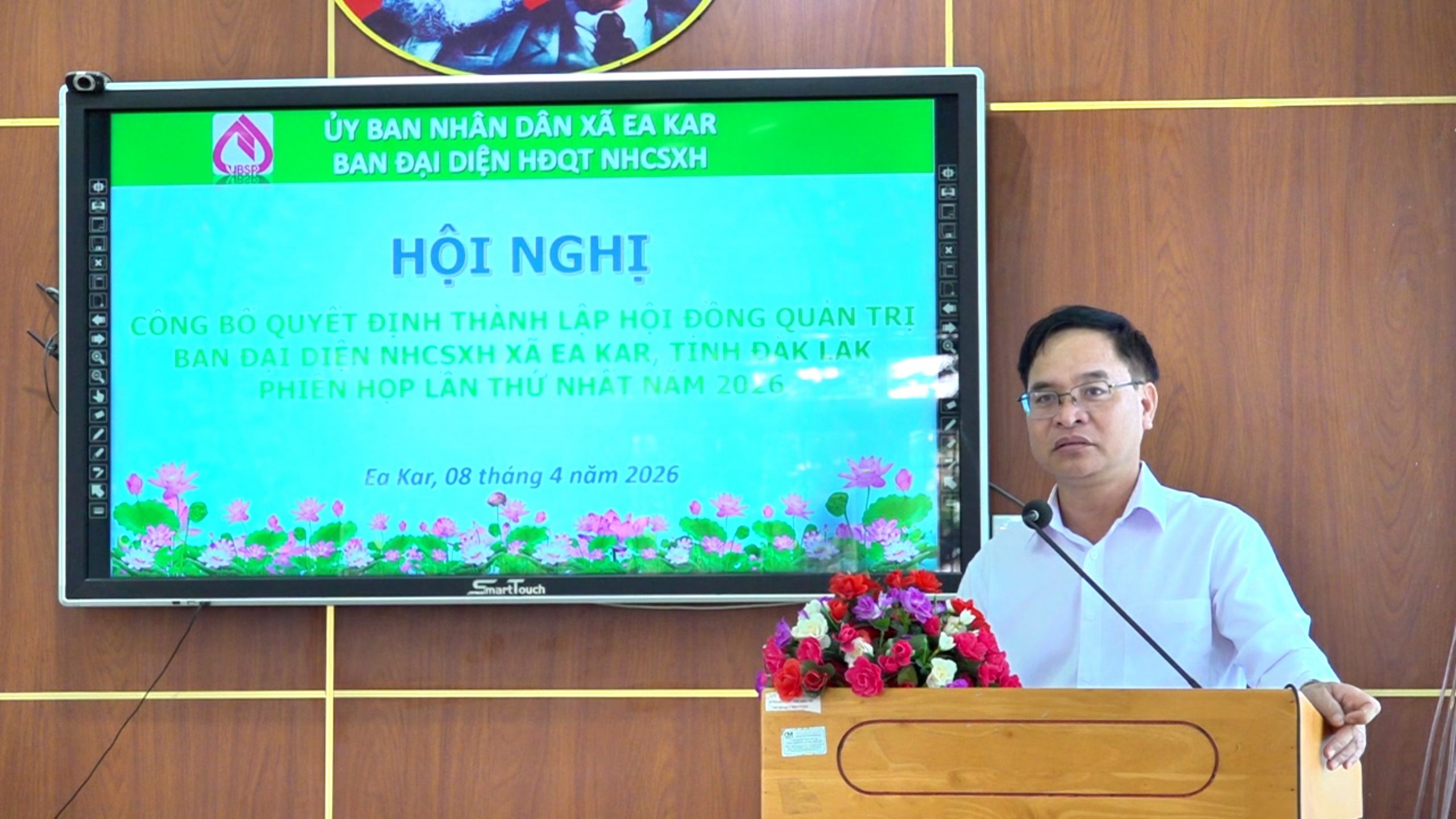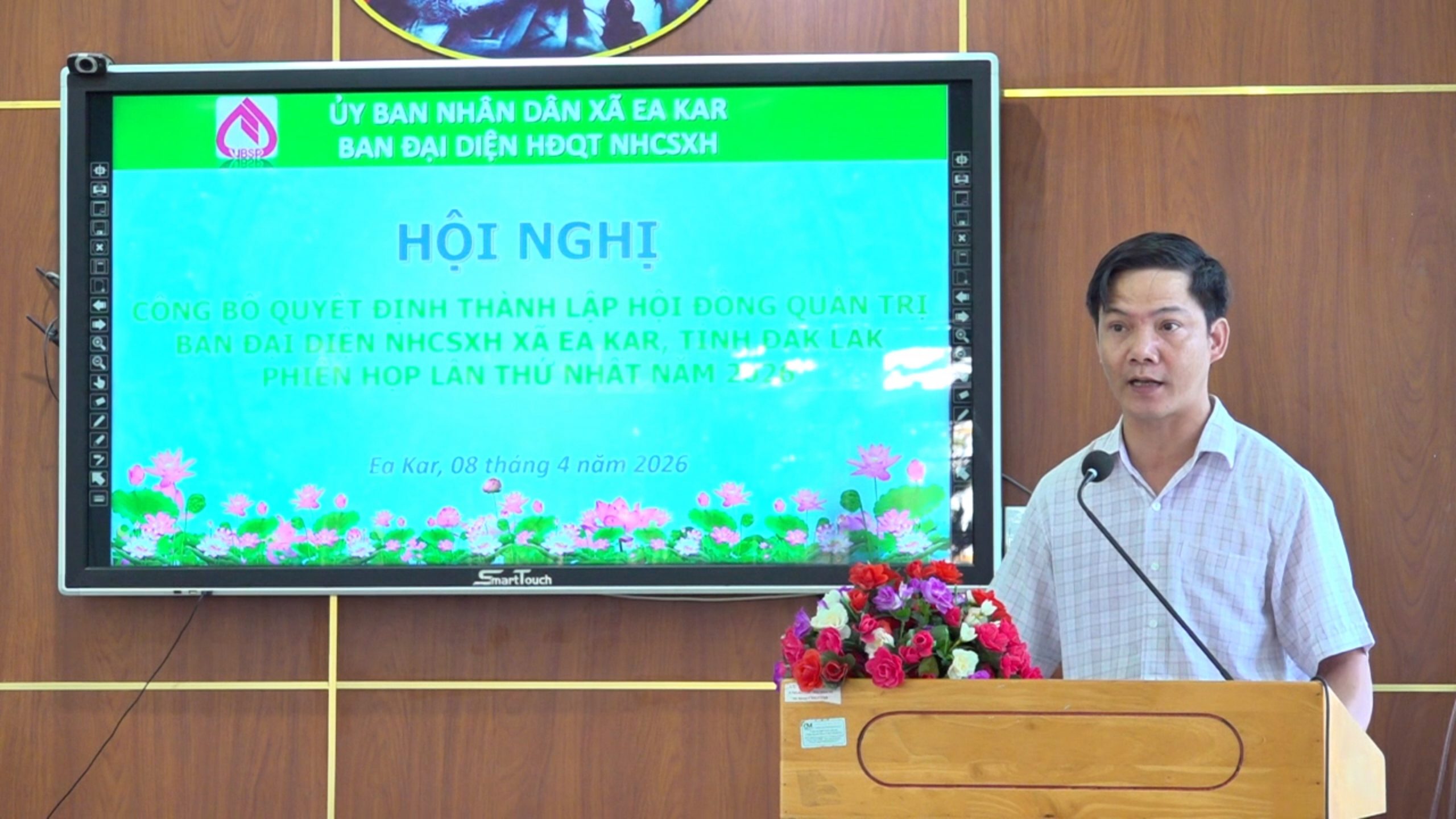 Sáng 8/4, UBND xã Ea Kar tổ chức hội nghị công bố Quyết định thành lập Ban đại diện Hội đồng quản trị Ngân hàng Chính sách xã hội (NHCSXH) xã Ea Kar; đồng thời đánh giá kết quả hoạt động tín dụng chính sách 3 tháng đầu năm và triển khai nhiệm vụ các tháng còn lại năm 2026. Dự hội nghị có ông Nguyễn Minh Chuyền – Phó Bí thư Đảng ủy, Chủ tịch UBND xã Ea Kar.